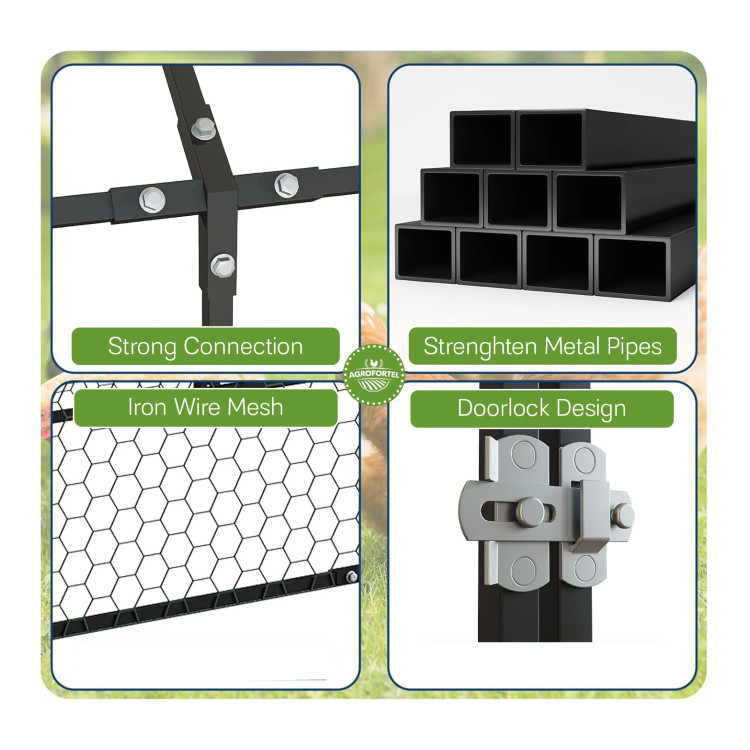 A tágas fém kifutó biztonságos mozgásteret biztosít állatainak a kertben. Masszív szerkezetének, hálójának és három különálló ajtójának köszönhetően ideális csirkék, kacsák, nyulak és libák mindennapi tartására. Közvetlenül tyúkólhoz is csatlakoztatható.