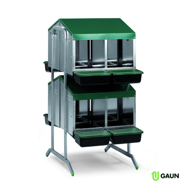 A praktikus GAUN 10135 tojófészek tojásgyűjtő kosárral segít, hogy a tojások a tojásrakás után tiszták és biztonságban maradjanak. A 8 férőhelyes kialakítás akár 40 tojótyúk számára ideális, a lábas kivitelnek köszönhetően pedig egyszerűen a tyúkól padlójára állítható. A lejtős fenék a tojásokat lerakás után a gyűjtőrészbe gördíti, ahonnan kényelmesen összeszedhetők.