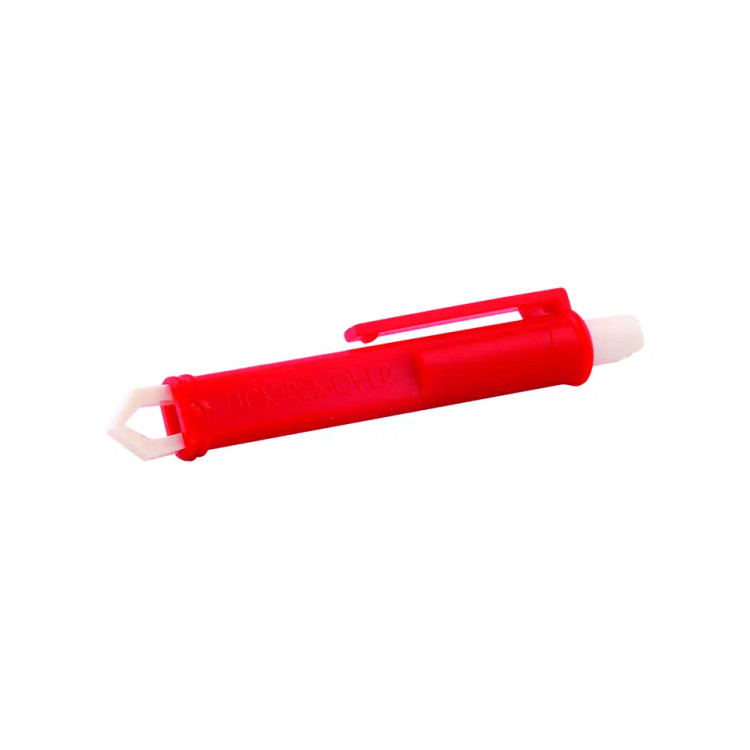 Kullancskiszedő fogó, toll alakú, piros színű, műanyag.