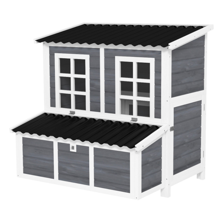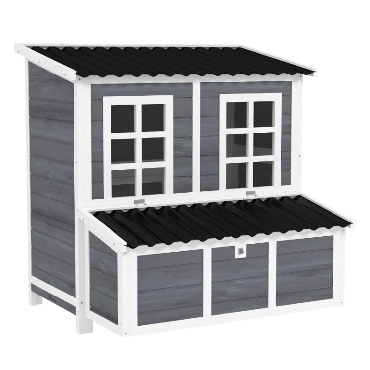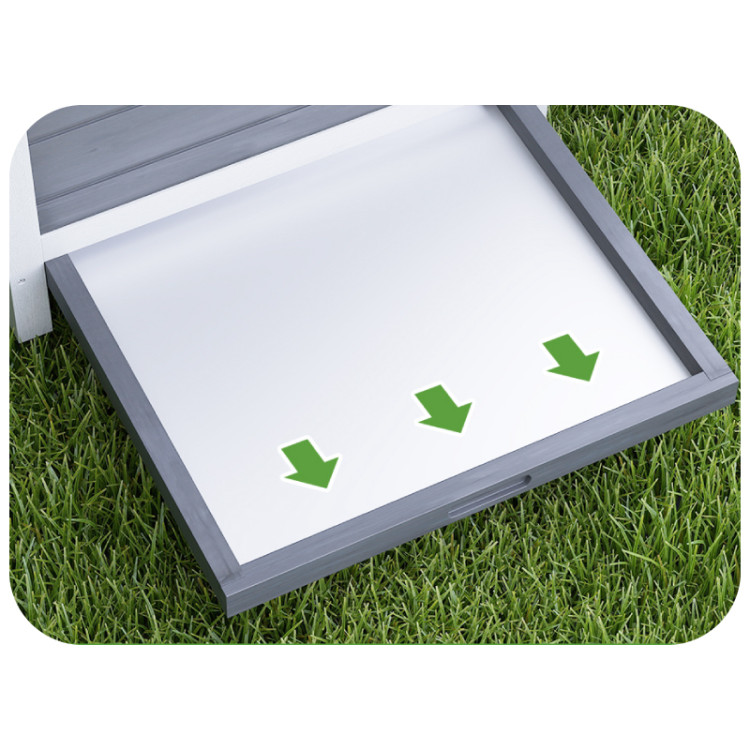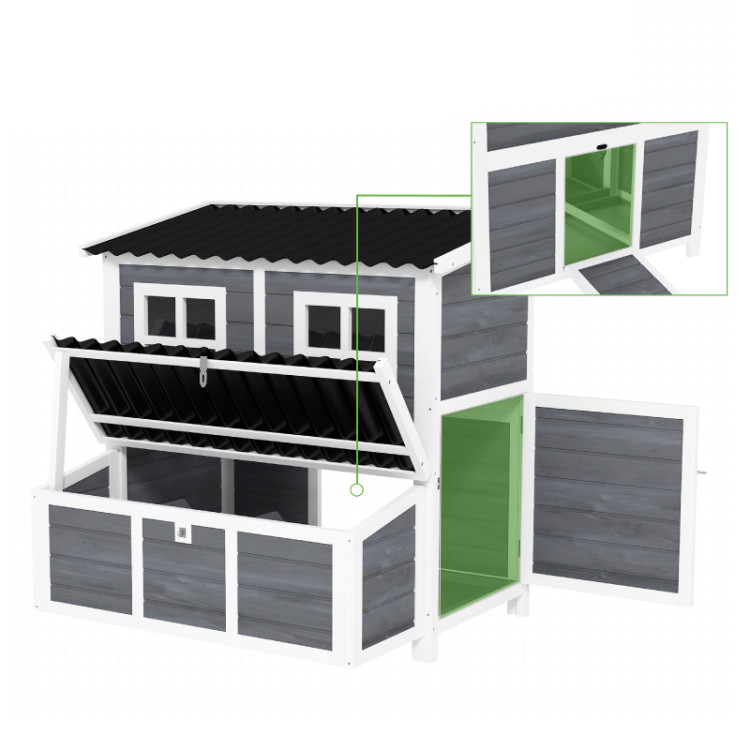 Két bejárati ajtónak és egy rámpának köszönhetően A tyúkok szabadon és biztonságosan mozoghatnak az ól és a kültéri terület között. A belső ülőrudak kényelmes helyet biztosítanak a pihenésre és az alvásra, míg az ablakok rengeteg fényt biztosítanak, és lehetővé teszik, hogy felesleges zavarás nélkül ellenőrizze a szárnyasokat. Az ól kiváló minőségű tömör fenyőfából készült , és vízálló bevonattal kezelt , ami meghosszabbítja élettartamát. A megemelt kialakítás megvédi a szerkezetet a talajból származó nedvességtől és javítja a légáramlást. A műanyag tető megbízható védelmet nyújt az eső és a rossz időjárás ellen.